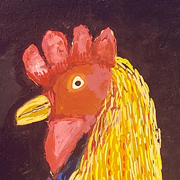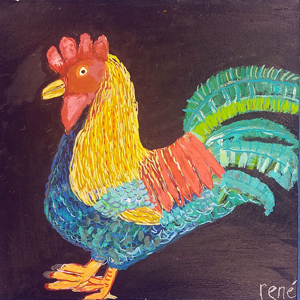 Deze haan is geschilderd in de herkenbare stijl van René. Het werk is gebaseerd op een foto, die René op geheel eigen wijze heeft vertaald naar een expressieve en fantasierijke creatie. Met krachtig kleurgebruik en een speelse benadering krijgt het Haantje een levendige uitstraling die meteen de aandacht trekt. Het schilderij straalt energie en creativiteit uit en is een echte blikvanger aan de muur.